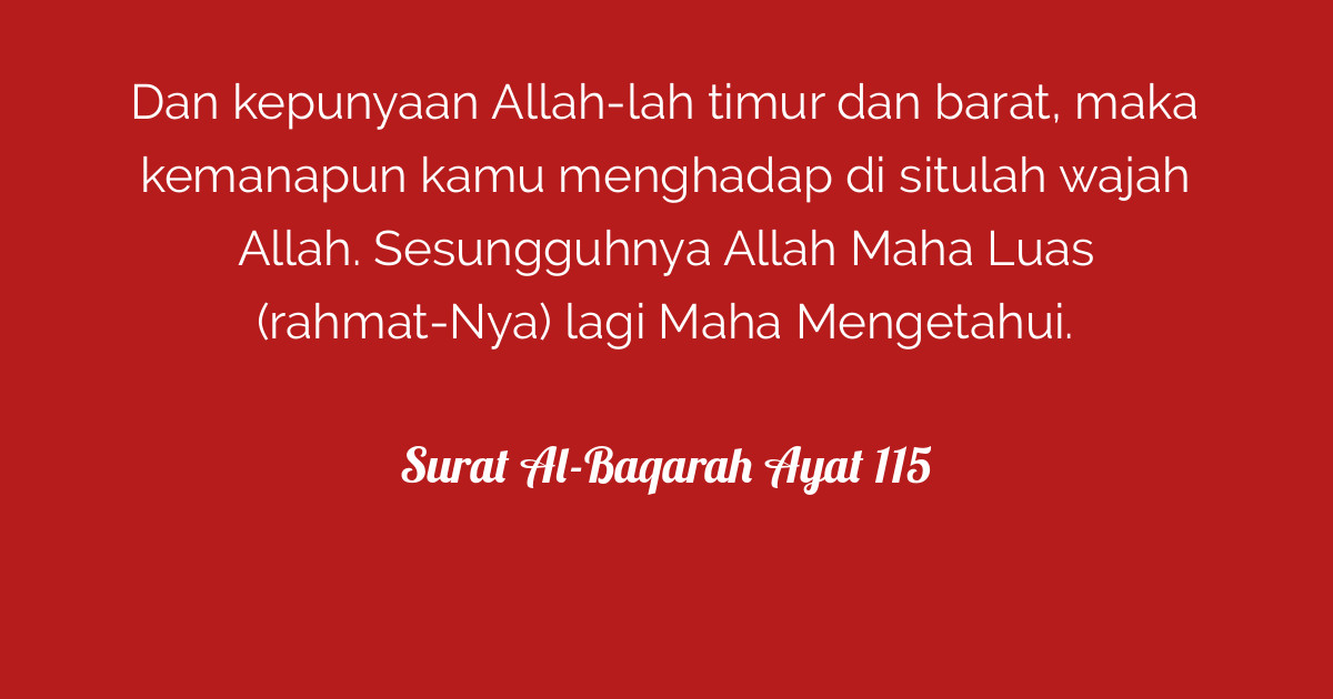 Dan Allah jualah yang memiliki timur dan barat, maka ke mana sahaja kamu arahkan diri (ke kiblat untuk menghadap Allah) maka di situlah wajah (arah yang diredhai) Allah; sesungguhnya Allah Maha luas (rahmatnya dan limpah KurniaNya), lagi sentiasa mengetahui.